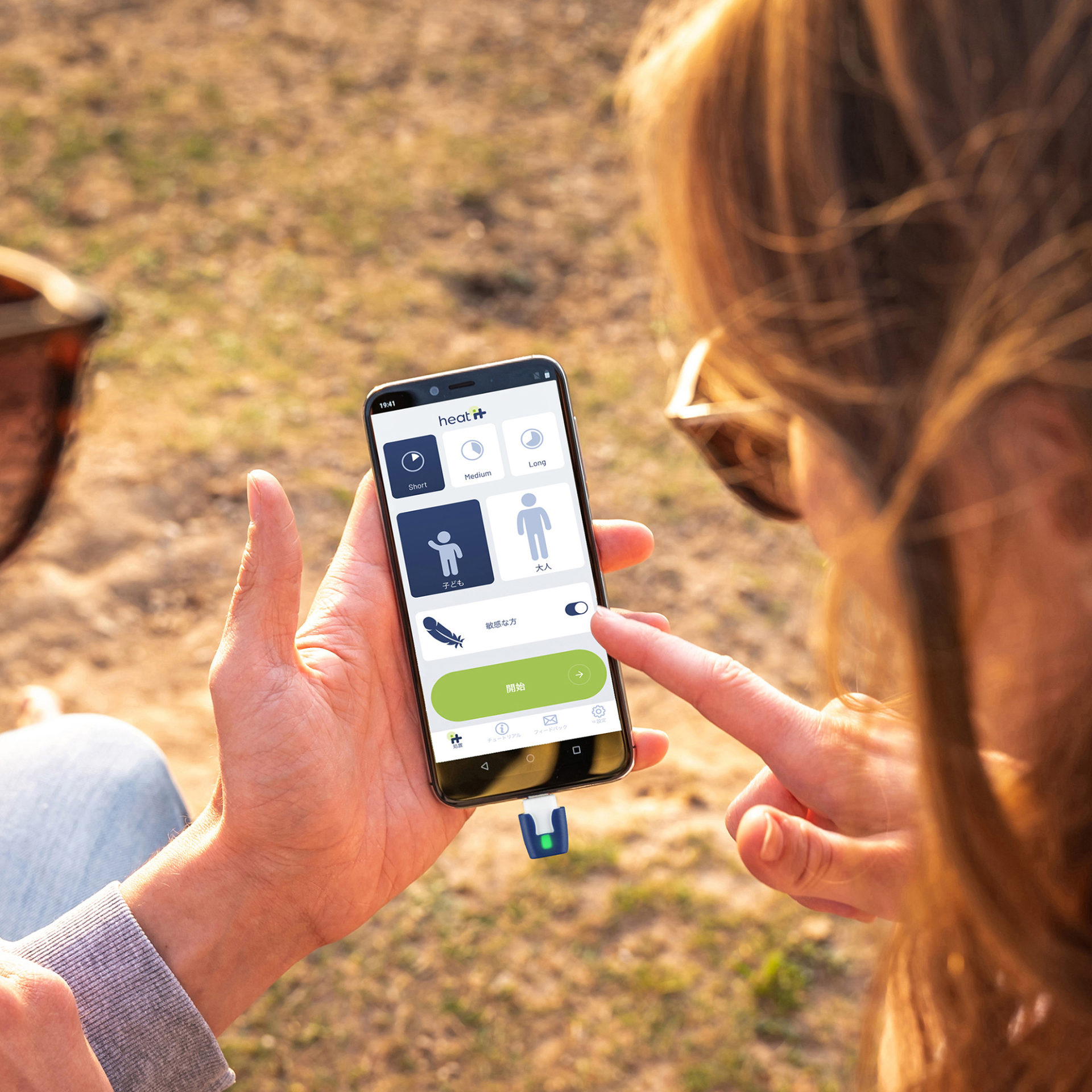 ヒートイットはUSB-Cポートを備えたスマートフォンの充電ポートに挿し込んで使用する、虫さされ後の肌をいたわる温熱ケアデバイスです。患部を約47-51℃のピンポイント温熱で、肌に新たな刺激を与えてケアします。蚊、アブ、ハチ、スズメバチなどに刺された後の肌のお手入れに使用できます。コンパクトなのでいつでもキーホルダーで持ち歩けます。